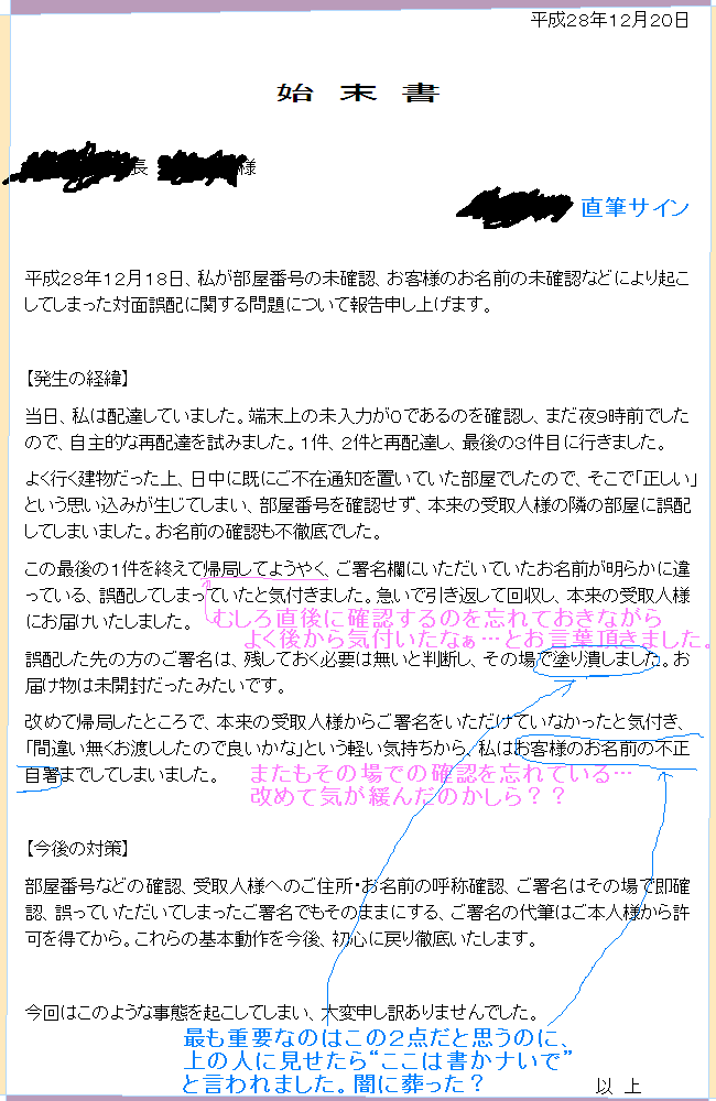 受領証の署名欄への塗り潰しとか不正自署とか、もう誤配…正確には“誤配達”に気付いた時点でパニックに陥ってたんだろうなぁ。